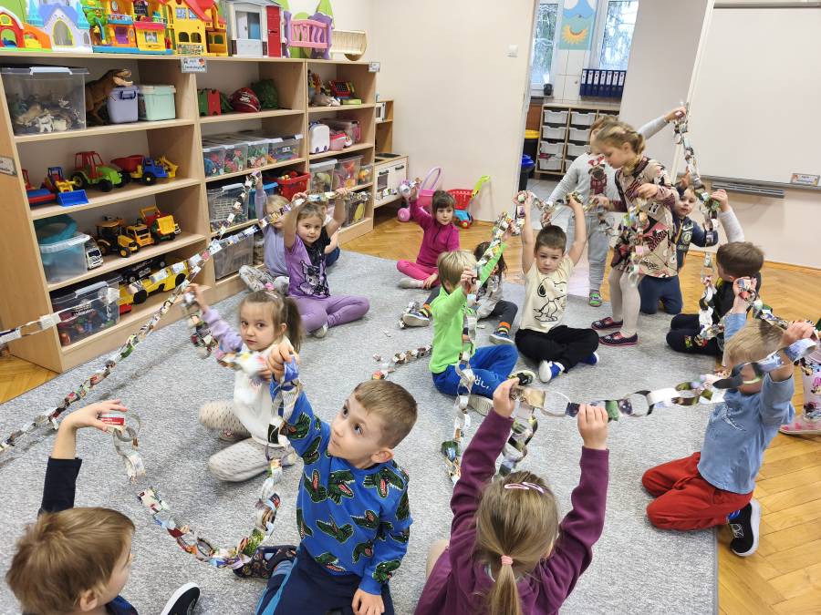 Listopad był również czasem ważnych uroczystości i akcji społecznych. Z okazji Narodowego Święta Niepodległości dzieci uroczyście odśpiewały hymn oraz zaprezentowały taniec krakowiaka. Włączyliśmy się także w akcję charytatywną Łańcuch dobra organizowaną przez fundację ProSalute, tworząc wspólnie długi papierowy łańcuch jako symbol wsparcia dla dzieci z dystrofią mięśniową. Z okazji Światowego Dnia Wcześniaka przygotowaliśmy fioletowe serca, okazując solidarność i pamięć o przedwcześnie urodzonych dzieciach.